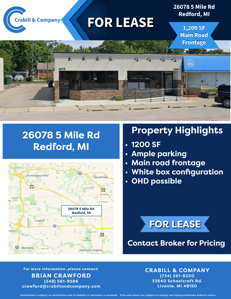 Versatile commercial space offering four separate suites totaling up to 3,970 SF (individual suites from 760 SF). Owner will divide to suit tenant needs. Features include new carpeting throughout, forced-air HVAC, and available signage for maximum exposure. Prime location with easy access to I-96 Expressway—perfect for office, medical, retail, or service users seeking convenience and visibility.