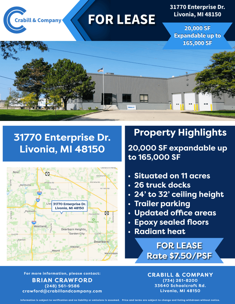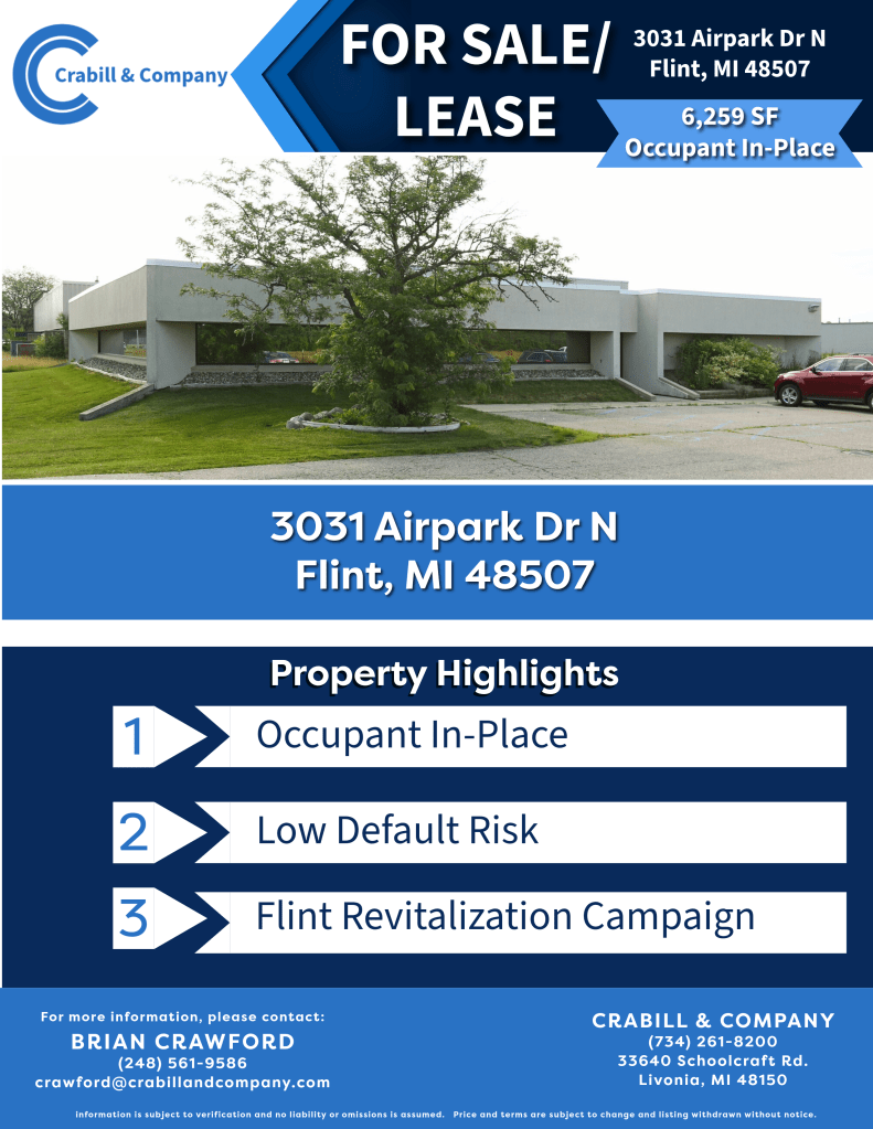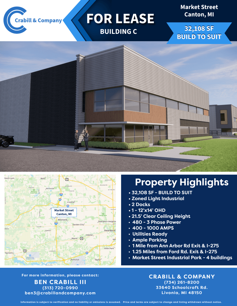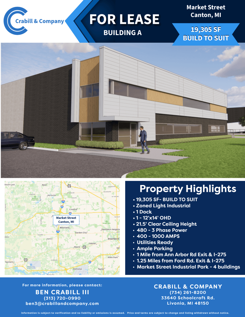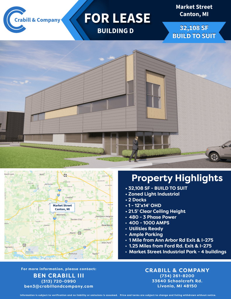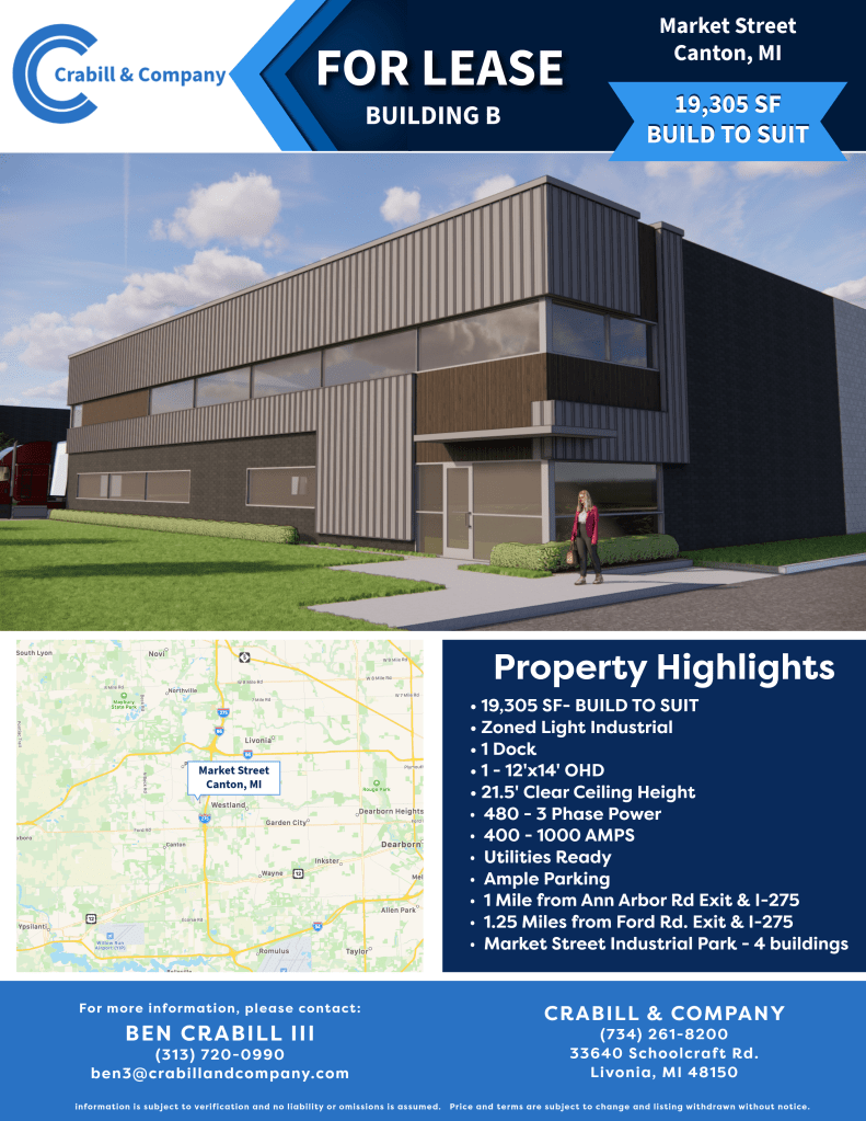 19,305 SF modern build-to-suit light industrial space with 21.5’ clear height, dock/OHD, 480V 3-phase power, and prime I-275 access (1–1.25 miles from exits) in Flint’s Market Street Industrial Park—ready for immediate customization.