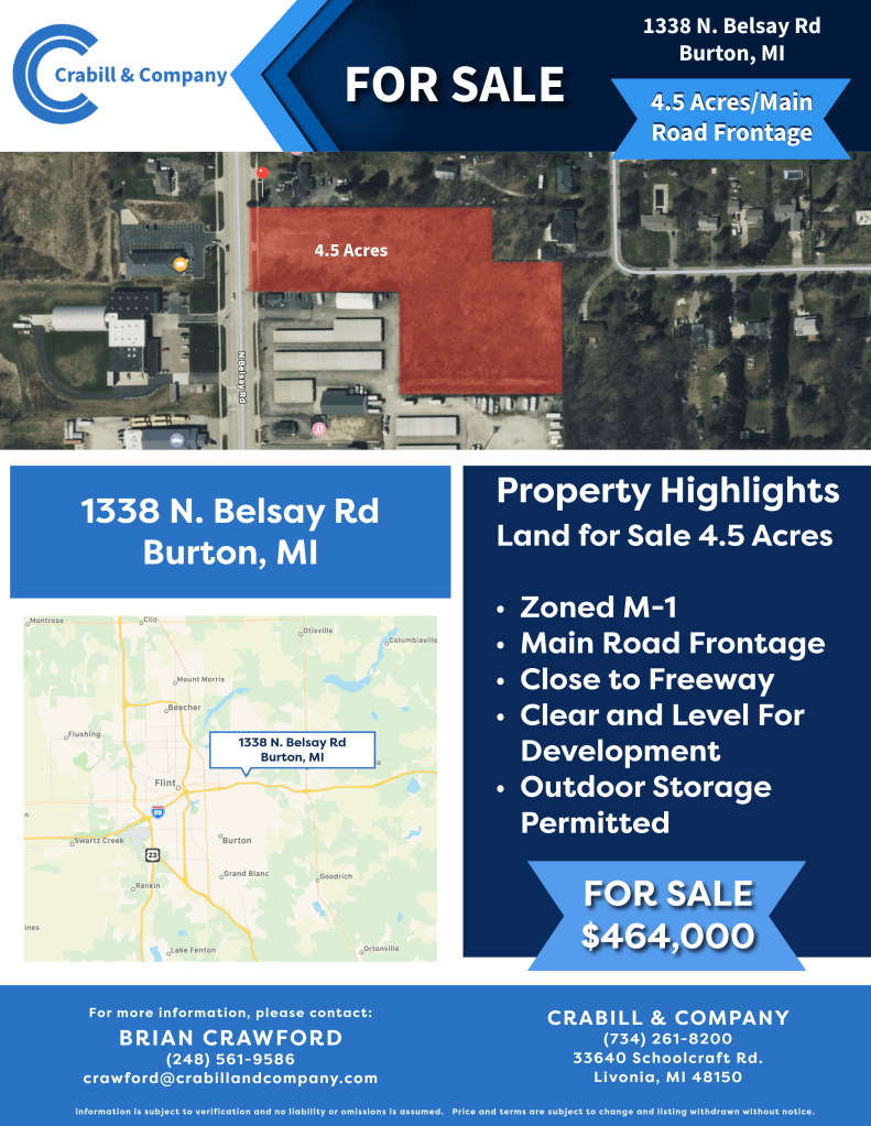4.5-acre M-1 zoned development site for sale at $464,000: clear, level, main road frontage, freeway-close, outdoor storage allowed — ready for immediate build or yard use.