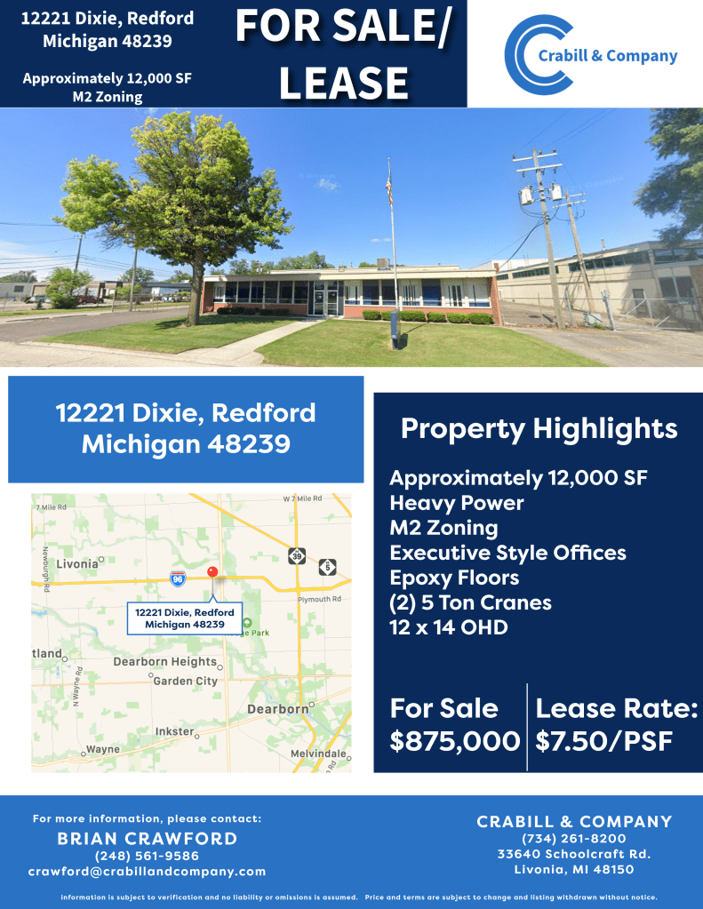12,000 SF M2-zoned industrial building with heavy power, (2) 5-ton cranes, epoxy floors, 12×14 OHD, and executive-style offices — move-in ready for manufacturing or heavy industrial use at $875,000.