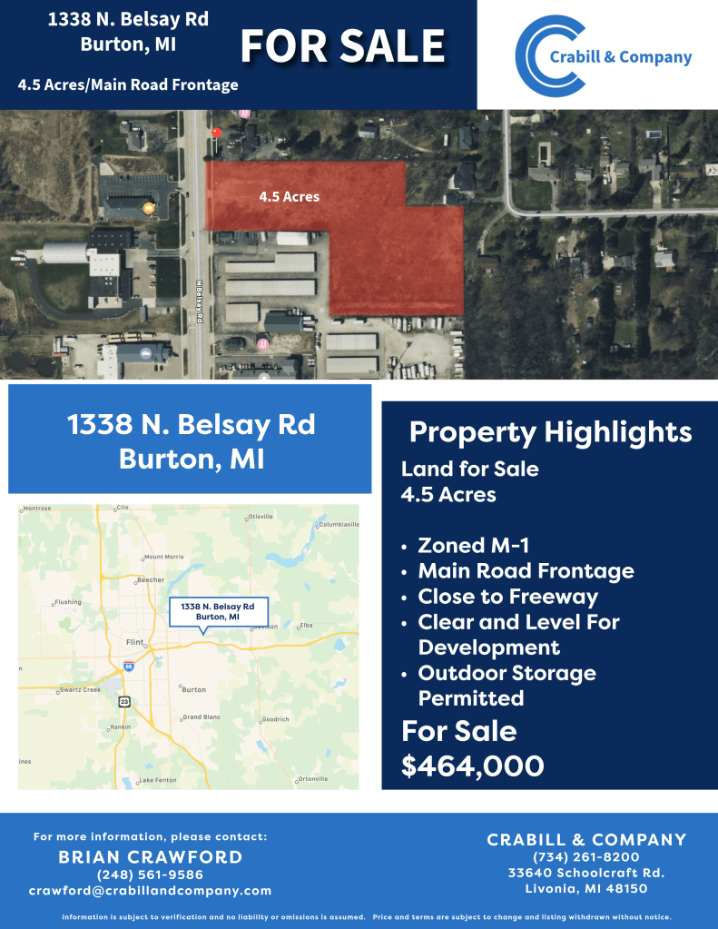 4.5-acre M-1 zoned development site for sale at $464,000: clear, level, main road frontage, freeway-close, outdoor storage allowed — ready for immediate build or yard use.