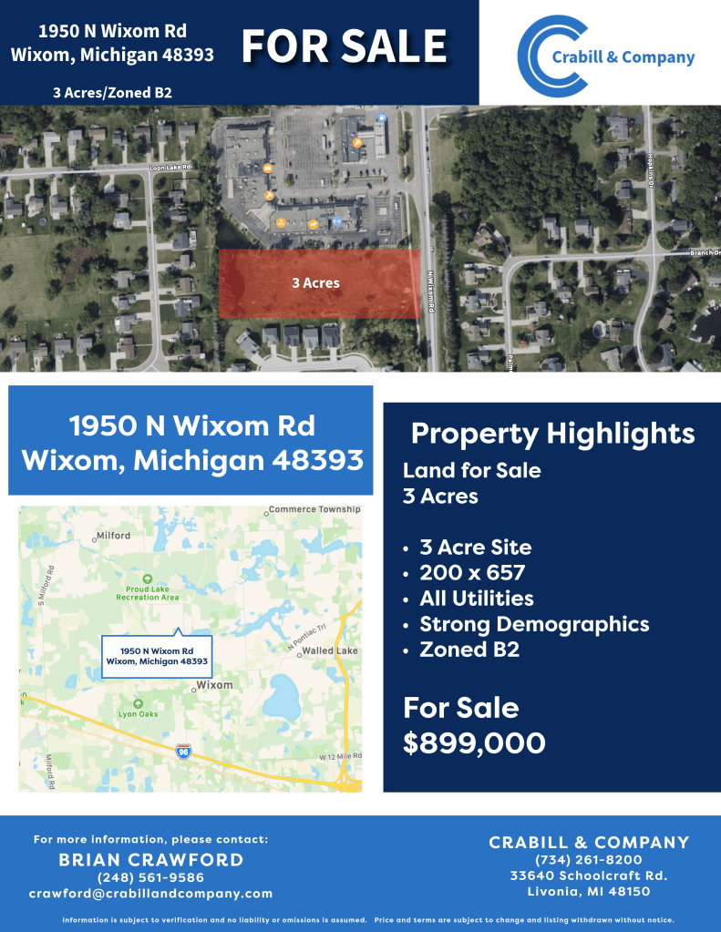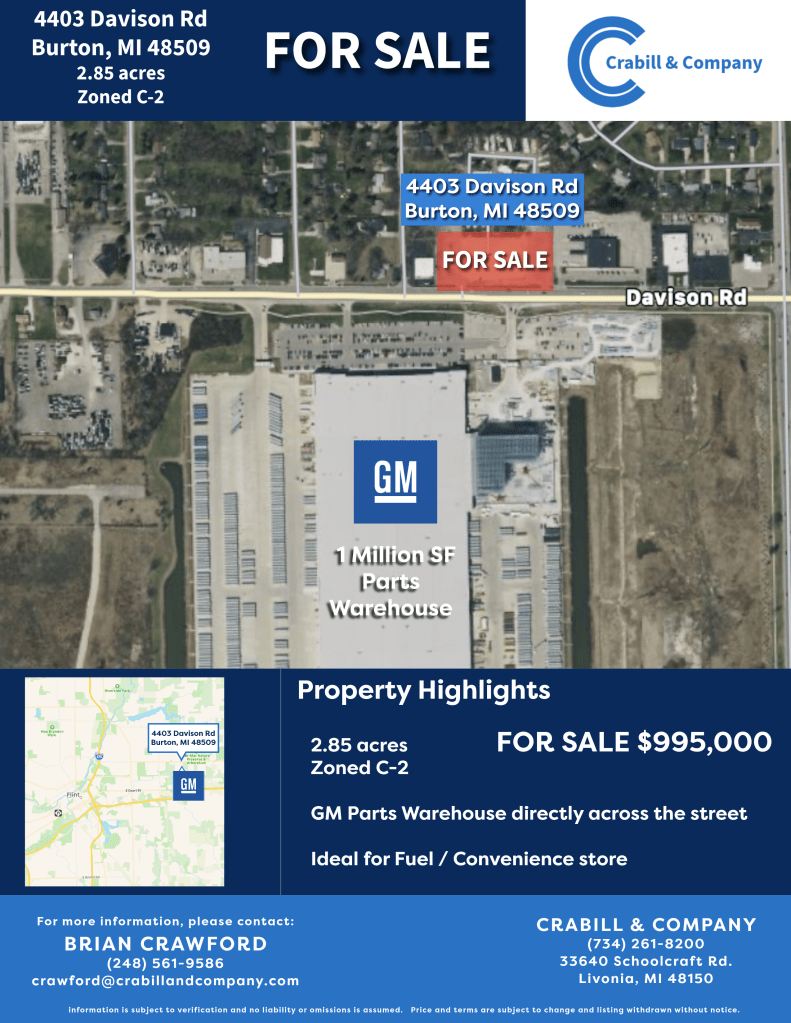 Prime 2.85-acre C-2 zoned parcel for sale at $995,000, directly across from GM Parts Warehouse – ideal for fuel station, convenience store, or retail development with high visibility and traffic in Flint’s industrial/commercial corridor.