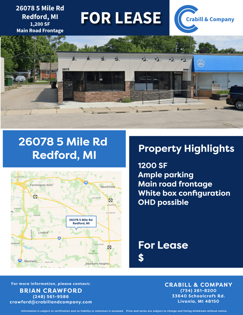 Prime 1200 SF white-box space with main road frontage, ample parking, and possible overhead door — ideal for service, retail, or small office use. Ready for immediate occupancy.
