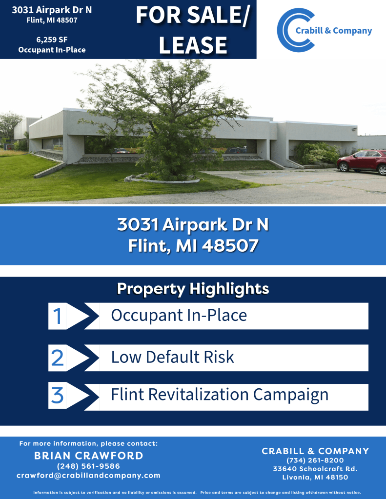 Fully leased 6,259 SF industrial/office building on 1.84 acres directly adjacent to Bishop International Airport. Long-term credit tenant ProMedica (healthcare) is in place with NNN lease. $46,950 current gross rent | 8.3% cap rate | $625,000 Immediate cash flow, low management, strong DSCR — ideal 1031 exchange or passive income play.