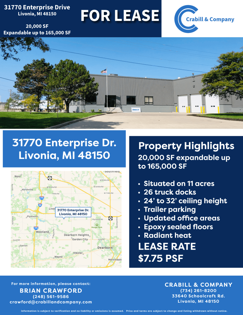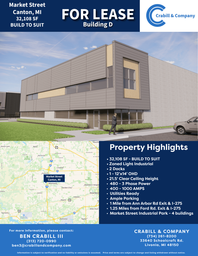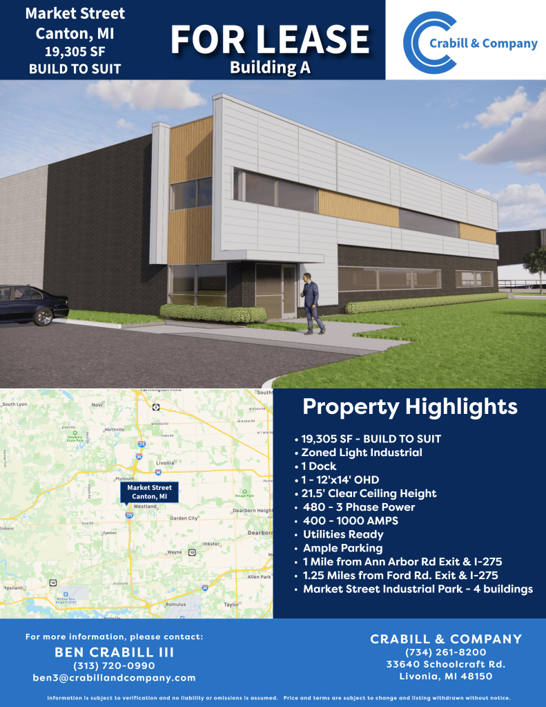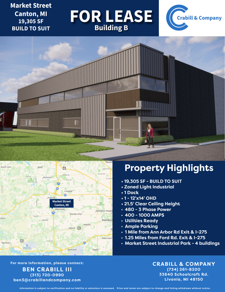19,305 SF modern build-to-suit light industrial space with 21.5’ clear height, dock/OHD, 480V 3-phase power, and prime I-275 access (1–1.25 miles from exits) in Flint’s Market Street Industrial Park—ready for immediate customization.